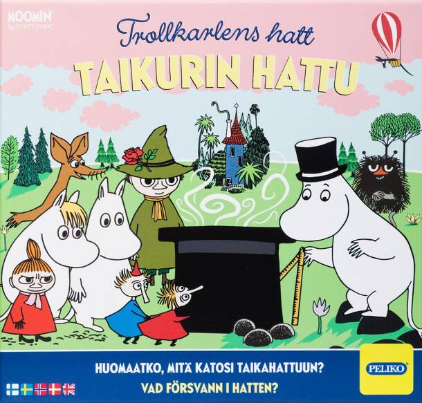 Muumi Taikurin Hattu ("Moomin the Wizards/Hobgoblins Hat") is a memory game with a magnetic magician’s hat! The picture tiles are placed inside the game box, and players have a moment to memorize them. Then the box is closed and the magnetic hat is placed on top. One of the players moves the hat over the box until it picks up a tile. The box is opened...