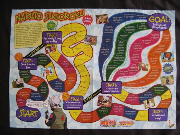 Naruto Sugoroku is a roll-and-move game that was included as a tear-out insert in the Shonen Jump Naruto Collector magazine for Winter 2007/2008. This game is loosely based on the traditional Chinese/Japanese game Sugoroku. In this game, players choose a character from the Naruto manga and then roll a die to move their characters along a track. Some spaces...