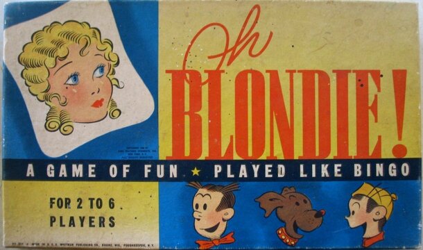 This game is based on the comic strip Blondie. Contents: Spinner with positions for Blondie, Dagwood, Alvin, Baby Dumpling, Mr. Dithers and Daisy. Playing board for each of Blondie, Dagwood, Alvin, Baby Dumpling, Mr. Dithers and Daisy. Paper chips used to mark positions on player's boards The obect of the game is to score points based on play. Each...