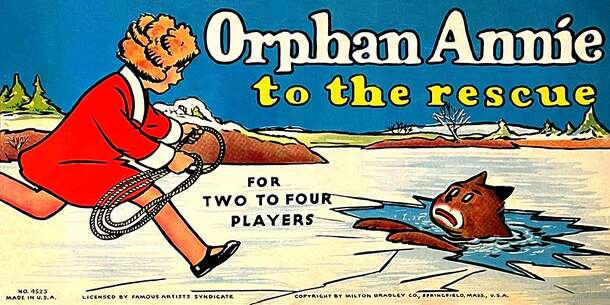Orphan Annie to the rescue is a Spin-and-Move game for 2 to 4 players. Each player takes a counter for his Orphan Annie. High Spin plays first. Spin dial in turn moving that number of spaces from the start. Some of the spaces are marked with indicators that vary the moves. When a counter lands on: + 'A' -- advance 2 spaces + 'T' -- lose one turn + 'x' --...
