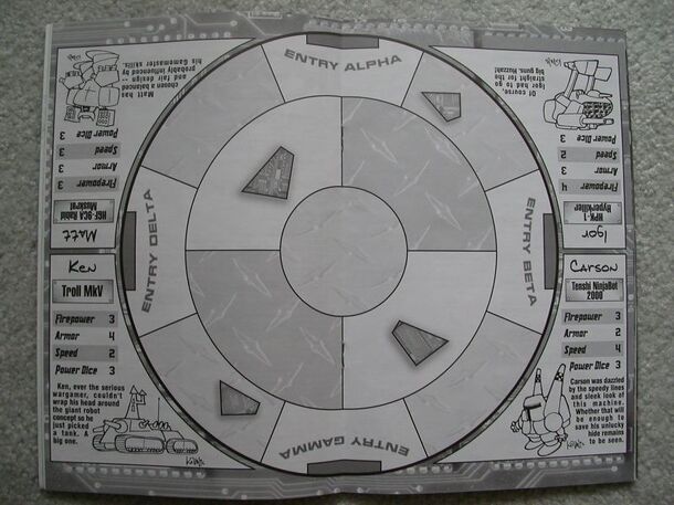 A free game included in the Dork Tower #14 comic book. Each player controls a RoboBasher (mechanical vehicles with differing attributes in Firepower, Armor, and Speed), moving it around an arena trying to destroy all the other RoboBashers. During each round, a player can use a limited number of "Power Dice" to boost the values of their RoboBasher's...