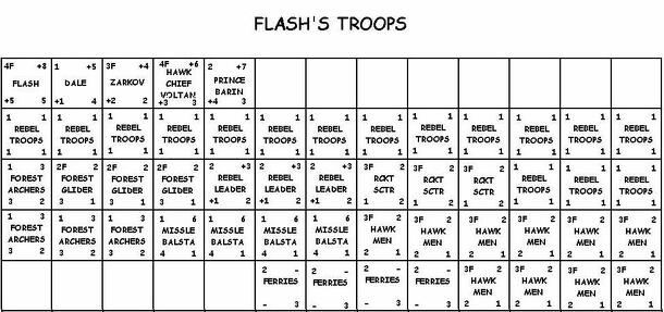 A game of full scale war on the planet Mongo. Set in the Flash Gordon universe. One side controls the forces of Human Hero Flash and his allies, Hawkman Chieftain Voltan and Forest Chieftain Baron. The other player controls the forces of Evil Emperor Ming. Each unit is rated for the following statistics: type, move, initiative, attack, defense, cost, and...