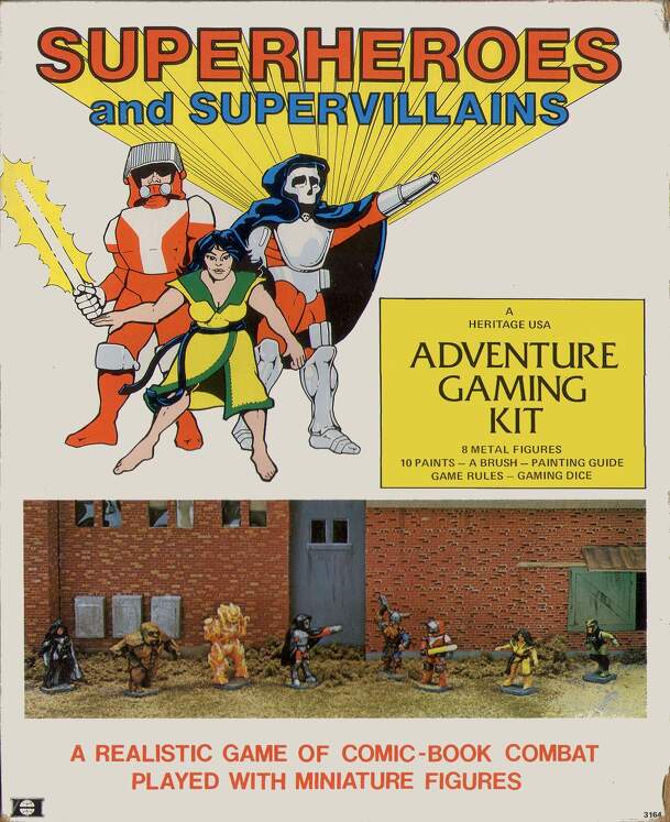 This is one of the "paint and play" games published by Heritage, USA. The kit includes eight 25 mm metal cast miniatures, primer, paints, painting guide and adventure game rules. The superheroes in the set are known as "The Knights of Justice". They include The Crimson Crusader, Donarr, Hornet, and Dragonflame. The supervillians from "The Syndicate of...