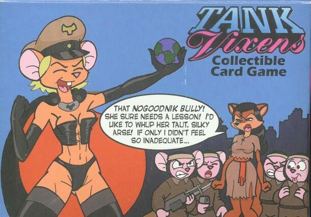 "The cardgame your mother should have warned you about!" Tank Vixens is a collectible card game based on the comic book of the same name. This is not your typical CCG, it is definitely adults only. The game consists of 106 cards which you use to assemble a play deck with a minimum of 40 cards. Each player requires their own set of cards. There are 6 types...