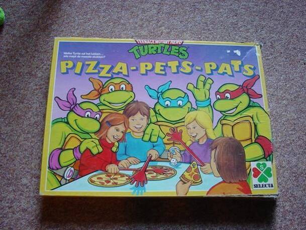 You are one of the four hero (not ninja) turtles. 12 cards are placed on the table in a 4*4 square without the corners. Each turtle starts in a different corner. You throw the dice and may move your turtle on the cards in any direction. When you land on a card, you turn it over. If the card shows a pizza, you get a pizza-card. When you land on an opponent...