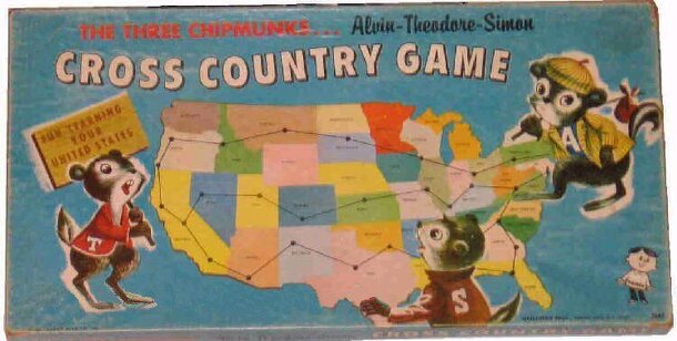 Object of the game is to complete a round trip from New York to California. Players choose one of the famous Chipmunks - Alvin, Simon, or Theodore to take a cross country journey. Game series based on the David Seville singing chipmunks. Other entries included Acorn Hunt and Big Record. Contents: playing board and 20 travel cards. Instructions for the game...
