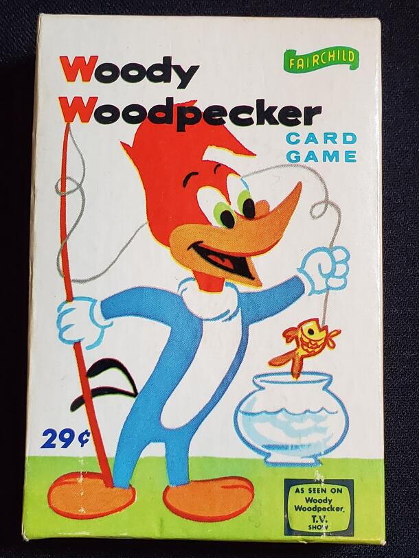 The Woody Woodpecker Card game consists of 40 cards, 10 each of 4 suits (Baseball, Football, Baseball Glove, Football Helmet). There are instructions included for multiple card games including Rummy, Have Fun with Stop and Top (War), and Pick Up Tricks (Trick taking game where you pick up cards if you cannot play the suit played.) Listed in American Games...