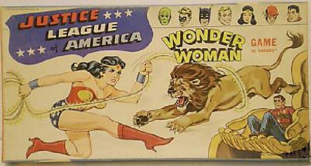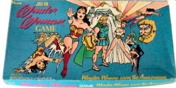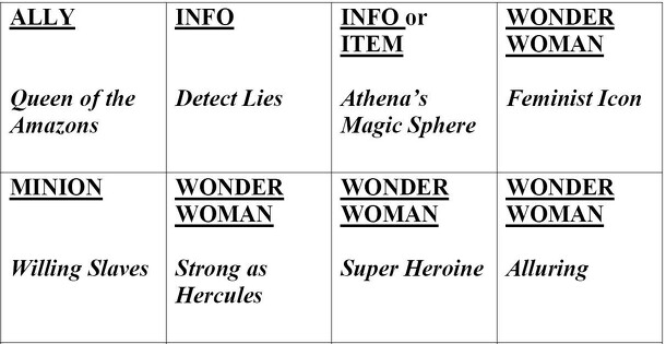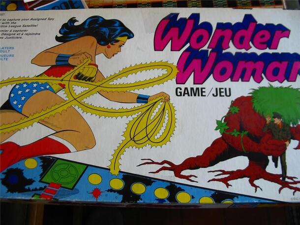 "Card game for 2-4+ players. Wonder Woman Theme." The game is played using a custom card deck. There are ten suits in the deck: Wonder Woman, Ally, Capture, Foe, Info, Plot, Quote, Item, Action, Minion. "The most feminist player goes first." The players score points by playing melds of four to ten cards, each of which must come from a different suit....