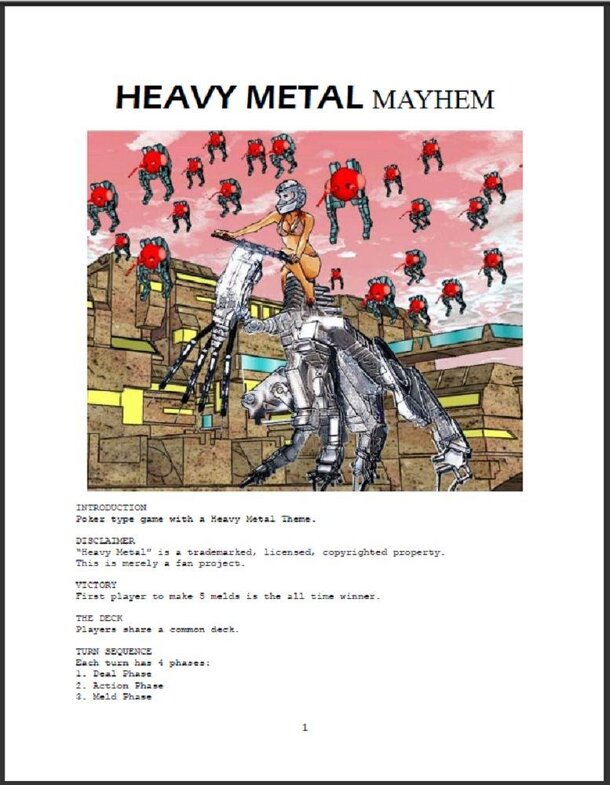 A card game which takes its theme from the universe of the science-fiction film Heavy Metal. The game uses a custom deck of cards. There are five types of cards in the deck: Hero (Heroine), Foe, Location, Travel, and Special Cards. The first player to make five melds wins the game. A meld consists of one Hero/Heroine card, two Foe cards, two Location...