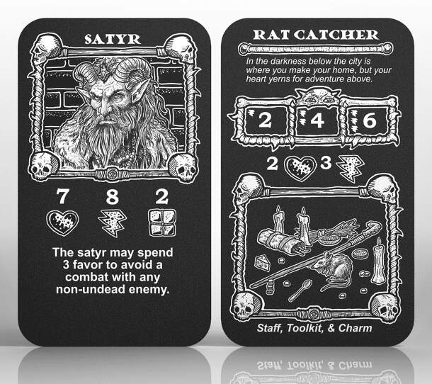 This Race/Class promo card for both Tin Helm and Tin Realm is included in the mint tin of Dustrunners (an expansion for Dustrunner). The double-sided card features the Satyr race and Ratcatcher class: The Satyr card gives the starting stats of 7 health/8 energy/2 rations and states "The satyr may spend 3 favor to avoid a combat with any non-undead enemy."...