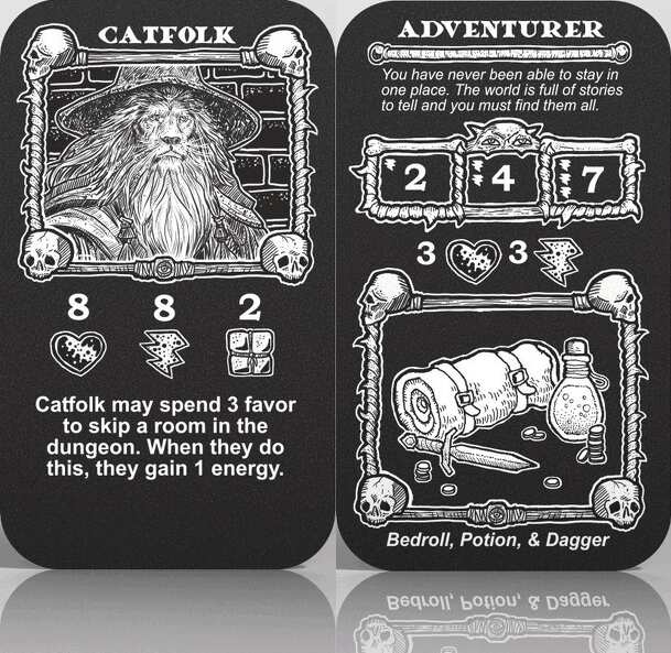 This Race/Class promo card for both Tin Helm and Tin Realm is included in the mint tin of Dragon Spark. It can also be found in Gnome Pack #1 (found at The Game Crafter). The double-sided card features the Catfolk race and Adventurer class: The Catfolk card gives the starting stats of 8 health/8 energy/2 rations and states "Catfolk may spend 3 favor to...