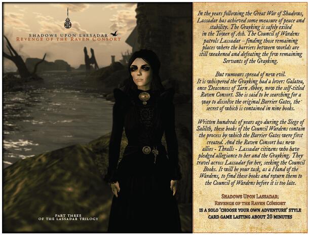 Revenge of the Raven Consort is the 3rd game in the Lassadar Trilogy (Shadows Upon Lassadar and Sorrow of Salilth are the other 2). This is a solitaire 'Choose Your Own Adventure' style card game lasting about 20 minutes Needed to play: • the 81 cards split into five separate game decks (Quest, Event, Combat, Spell and Win/Loss) each with their own icon...