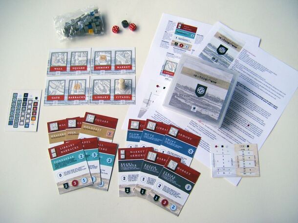 The box contains five specialty dice: one white die called “tee-ball” and four green dice called “the strokes”, a dice cup, two scorepads, and one rules sheet. The players note the par score for the hole they are playing and roll one fewer green die than par. The players will always roll the tee-ball die. The result of the roll is the player’s score for...