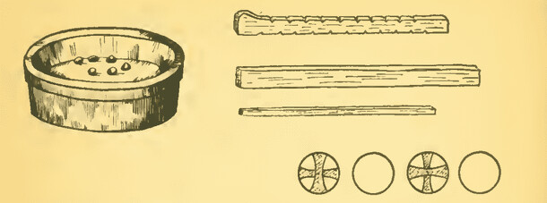 A game that was played by the Passamaquoddy Indians of the northeastern United States. The components include a shallow wooden bowl (about 12 inches across and 2 inches deep), 6 plum stones (plain on one side and carved and colored on the other), forty-eight small sticks approximately 6 inches long, 4 longer sticks, and 1 longer stick which is notched. The...