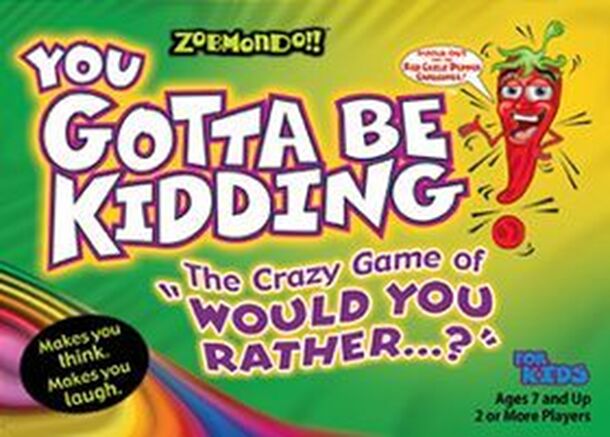 Children's version of the Zobmondo!! games (ages 7 and up). On your turn, you roll a die and move your pawn that many spaces. Pick up a "Would You Rather" card and select which of the two choices you would rather do (such as "Would you rather: 1) Run across a hungry alligator's back; or 2) Run under an angry elephant?"). Your opponents decide which they'd...