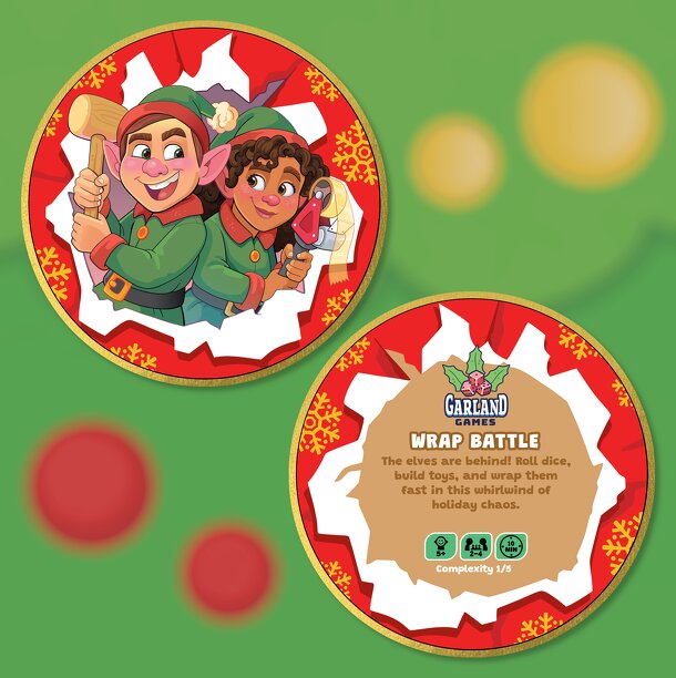 In Wrap Battle, you know that toys are magic... sometimes literally! Each turn, you make 3 dice rolls and then act. You can either build a toy, whereupon it comes to life and grants you special abilities, or wrap a toy, gaining points. Toys can work together to create powerful combos, but the toys must be wrapped, so they can go to the good little girls...