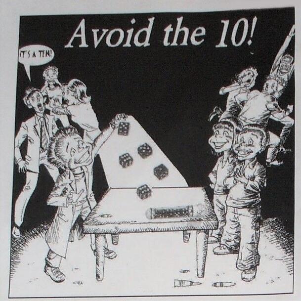 A dice game in which you roll 5 dice three times, setting one aside each time, trying to get the highest score possible. If your total is over 10, then you get points worth the difference between your score and 10. However, if your total is less than 10, you get points equal to three times the difference between your total and 10. If your total is 10, you...