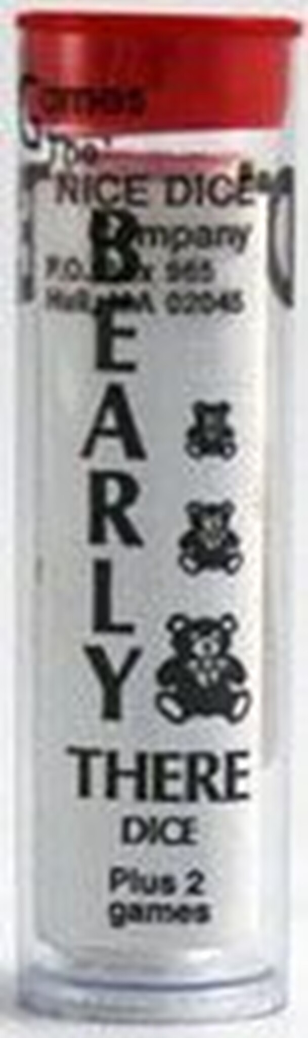 A set of five six-sided dice in a tube with a leaflet containing rules for Bearly There and two other games (Accumulation and Horse) The dice are identical, each having have a bear and the numbers from two to six. The object of Bearly There is to roll the dice, totaling the numbers and pushing your luck to reach a specific total. Although it looks like a...