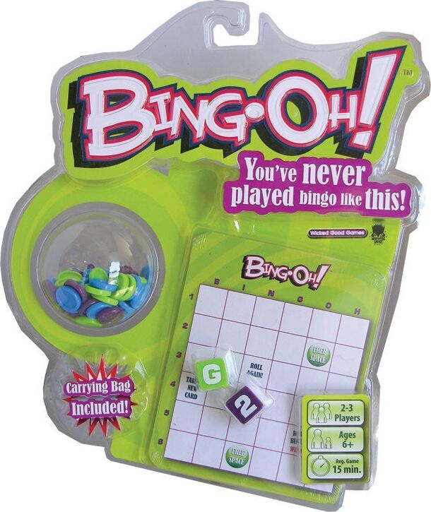 This is the CRAZIEST bingo game you'll ever play! Choose your Bing-Oh!™ card at random. Each one is different. Take turns rolling the Bing-Oh!™ dice. Place your chips on the corresponding space and let the MADNESS begin! Depending on the square your chip lands on, you may get to steal chips from your opponent, add extra chips to your card, lose a turn...