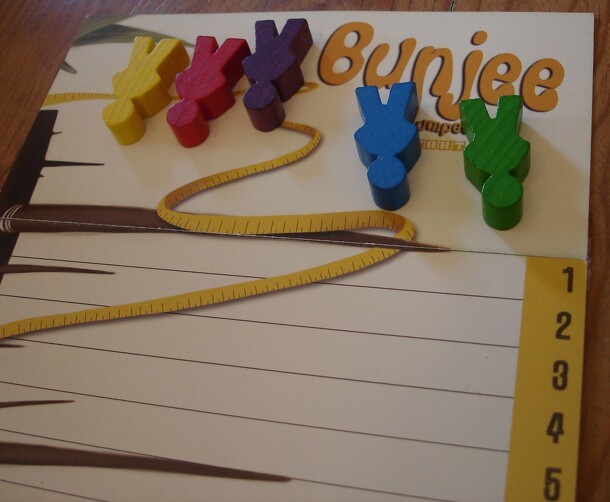 Bunjee is a simple dice rolling game with some risk management. Each player is playing a figure jumping from a tree, trying to fall low enough to reach the goal but not too low to avoid crashing on the floor. On his turn, the player launch the dies, hecks the result and decides to satisfy himself with the result of the dices or roll some dices again to...
