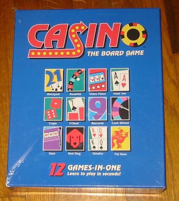 Casino The Board Game is a roll and move game in which players move around a board and play 12 different games of chance based on what space they land on. The game includes the following casino games: 8 Card Games Baccarat Blackjack Hold ' em Omaha Pai Gow Poker Red Dog Seven Stud Video Poker 2 Spinner Games Cash Wheel Roulette 1 Dice Game Craps 1 Jackpot...