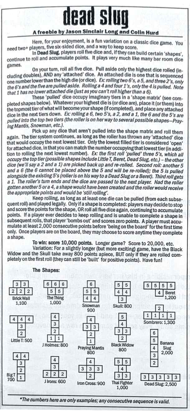 In Dead Slug, players roll five six-sided dice and, if they can build certain shapes, continue to roll and accumulate points. It plays very much like many bar room dice games. You need two+ players, five six-sided dice, and a way to keep score. On your turn, roll all five dice. Pull aside only the highest dice rolled (including doubles), AND any ‘attached’...