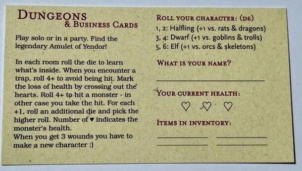 Dungeons & Business Cards is a fantasy role-playing game in business card format. All you need is a pen and a die. You can play it alone or with friends. It's a small and entertaining game that fits in your wallet. Playable at parties and with children. Roll your character. Disarm traps. Kill monsters. Find treasure. Reach the next levels on the next...