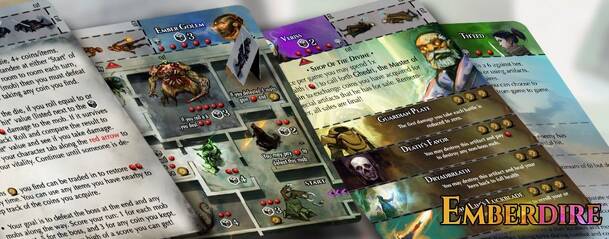 Emberdire is a big game in a tiny package, a light RPG dungeon crawl on a single poker card. The premise is simple: Choose your character and move from room to room, defeating monsters (mobs) and get to the end of the dungeon alive. All you need to get started is a six-sided die and a few coins to represent the treasures you'll find along the way. You cut...