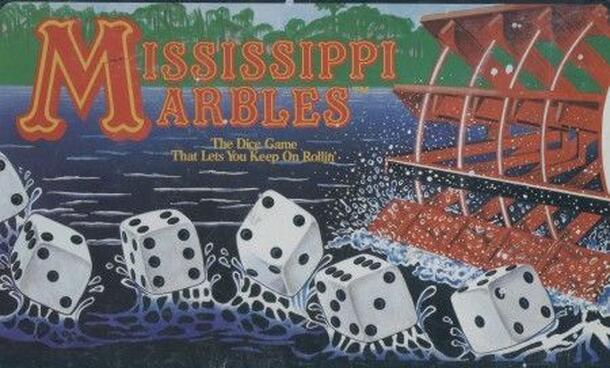 Mississippi Marbles -- "The dice game that lets you keep on rollin'." Variant of the Ten Thousand dice game family with a delta riverboat theme. Game consists of six dice, one score pad, dice shaker, velvet pouch, and dice tray. Requires 700 to open, then player can take the score and pass the dice, or press his/her luck and keep rolling. Winner is the...
