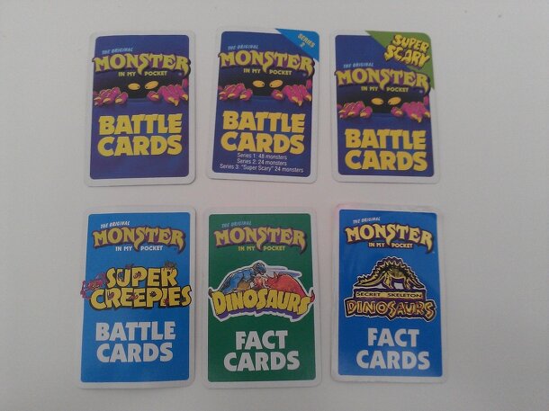 Monster in My Pocket Battle Cards is a simple game played by two or more. The game features a deck of 48 cards, each displaying a Monster in My Pocket monster (eg. 'Werewolf', 'Hobgoblin', 'Manticore') along with five statistics: intelligence, strength, speed, weakness and point value (a total of the other categories), plus two Wild Cards. After the deck...