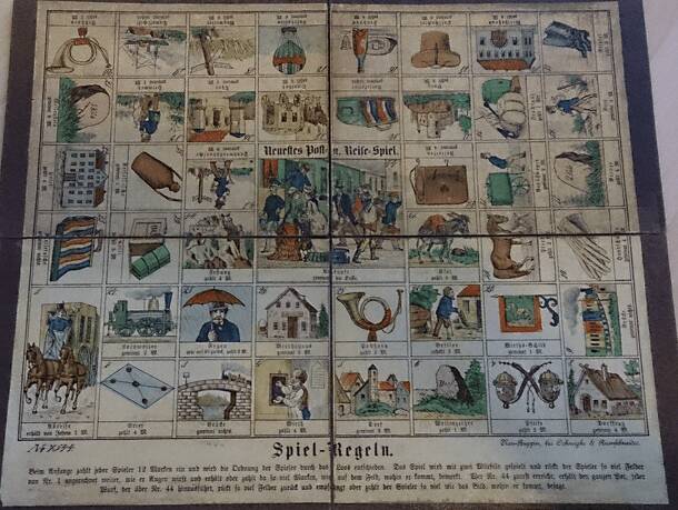 Objective: Be the first reaching space 45 - moving by turns - Simple 'Roll&Move' game; each space you land on has printed instructions you have to follow immidiately like: step forward or backwards, pay or get...; space 45 must be reached precisely; note: Game should had been published early 1900 (indicated by drawings and numbering system); publisher was...