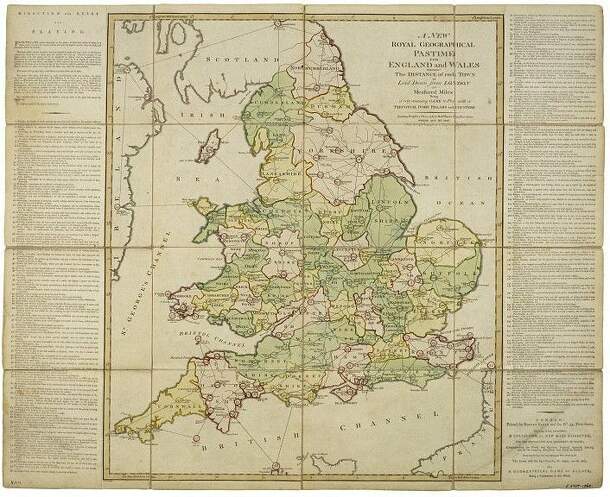 At the gameboard there are 169 principal and county towns joined by lines. The descriptions and rules on either side of the map list each town and any rewards or forfeits to be made. There are no charges for moving from one place to another. One of the better rewards occurs at Stonehenge 'worthy of visiting without expense, from whence you are to be...