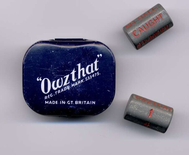 Owzthat is a simulation of the game of cricket using dice. The game consists of two unique dice; one of them labelled with numbers, the other with words. The idea is that the player who is "in" rolls the numbered die, scoring the number of runs as shown on the die. This continues until he rolls the side of the die with the word "Owzthat!" (a corruption of...