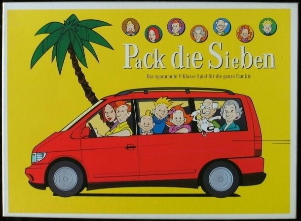 Promotional family game, published by Mercedes Benz & Ravensburger. Theme A road trip with grandma, grandpa, mum, dad and three children, who all have to be put into the car so that you can be the first to reach the holiday destination. Goal Be the first to reach the finish line by successfully completing activities and being lucky in a roll-and-move part....