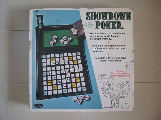 Yahtzee meets Poker meets Tic-Tac-Toe. The game board is a 4x4 grid and in each cell lies a record-keeping area noting eight possible poker hands and one hole for each card from 2 through ace. Players take turns rolling 13 6-sided dice to generate five-card poker hands (choose the best "cards"). They also roll a randomizer die which tells them how many...