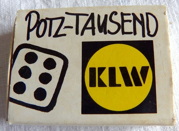 Potz-Tauseng consists of a small score block and a die inside a matchbox. Each player gets a score sheet that can hold the player name, 9 digits and the final score. In turn order everyone rolls once and writes the number in one of the fields. After 9 rounds players add their entries as three-digit numbers. Your score is the difference of your sum to 1000....