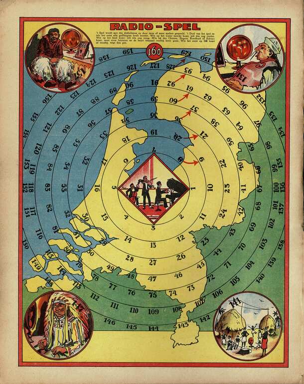 The rules are written in older Dutch and include typical stereotypes, prevalent in the 1920's. Translation: "The game is played with a die and by two or more players. The aim of the game is: to see who reaches all wavelengths first. Anyone who ends up on the water moves forward one space. Anyone who lands on land moves back space. Anyone who comes to the...