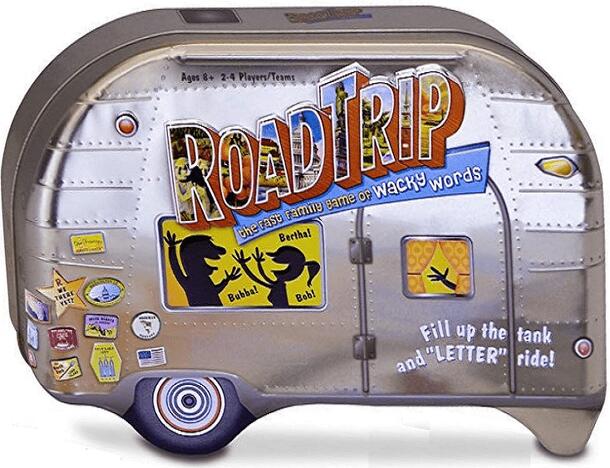 Road Trip, the fast family game of wacky words, comes in a camper-shaped box. It is for 2-4 players or teams. From the publisher: Can you rattle off three towns that start with the letter "P"? What about three fast foods that contain the letter "B"? Or, finish the "Tale of the Trip" by filling in the blanks with words beginning with "A"? How's this: "When...