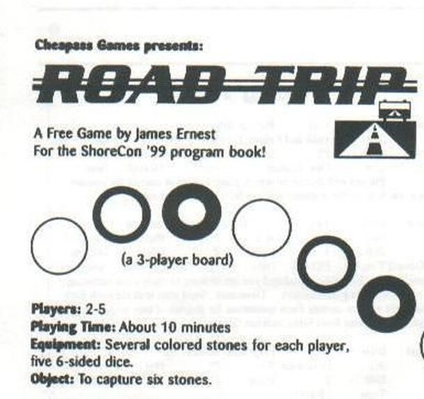 Road trip is an unusual counting game in which the only choice is how many dice to roll. Each player has stones of one color, which are arranged in a line of alternating colors. If playing with two players, each player has two colors. Whoever's color is first in line decides how many dice to roll (one to five), rolls the dice and counts down the line. If...