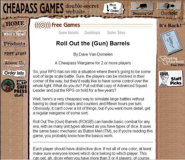 Roll out the Gun Barrels (ROtGB) is a free game from Cheapass Games. Downloadable from http://cheapass.com/free/games/rotgb.html From the website: Well, here's a very cheapass way to simulate large battles without having to deal with maps and counters and fifteen hours per turn. Obviously, it can't cover a lot of things, but if you want more detail, get a...
