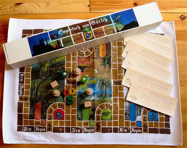 The goal of the (simple) game is to jump up with your pawn fastest on a so-called "legend stone" to reach the matching legend field with him. The players move their pawns by dice roll and can move other players' pawns according to different rules. The beautiful map (printed by serigraphy) is designed after 6 typical local legends, the suitable stories are...