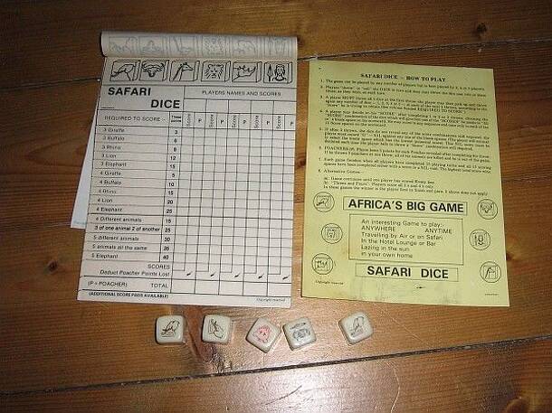 A simple dice game similar to Yahtzee. The player rolls five dice, which depict 5 different animals (giraffe, buffalo, rhino, lion and elephant) and a poacher. There is a scoresheet where you attempt to collect various sets (e.g. 3 giraffes, or 5 different animals), you get a varying number of points based on the difficulty of the set you are trying to...