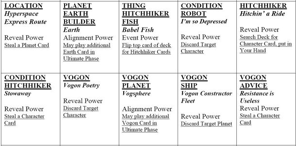 "Card game for 2-4+ players. Hitch-Hiker’s Guide to the Galaxy Theme. Victory: The First player to complete the requirements on a Quest card he controls wins the game." The game is played using a custom deck of approximately 80 cards. There are eighteen different types of cards in the deck. These include Quest, Main Character, Character, Planet, Robot...