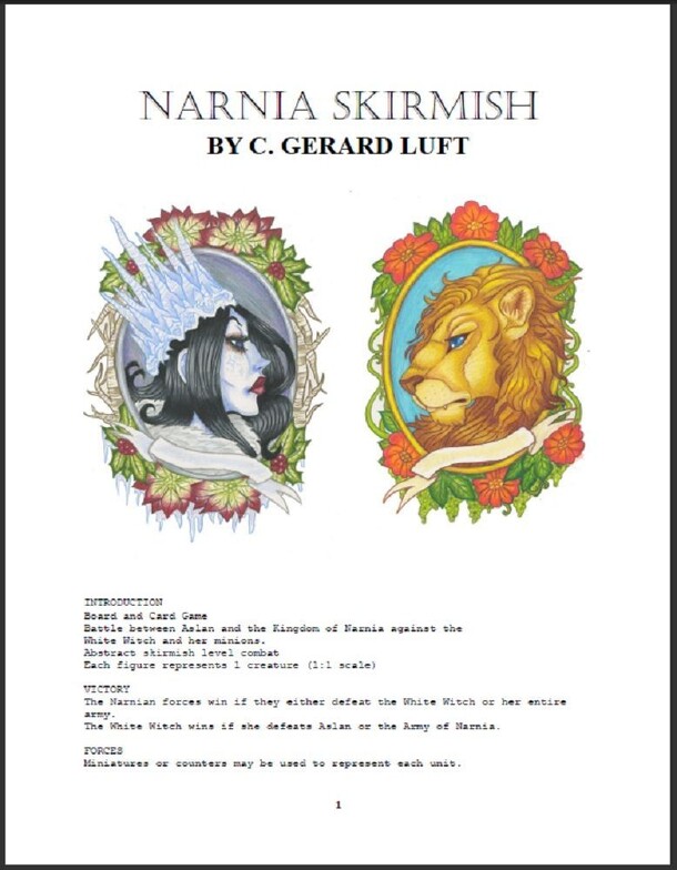 "Board and Card Game. Battle between Aslan and the Kingdom of Narnia against the White Witch and her minions. Abstract skirmish level combat. Each figure represents 1 creature (1:1 scale). Victory: The Narnian forces win if they either defeat the White Witch or her entire army. The White Witch wins if she defeats Aslan or the Army of Narnia." The Forces of...