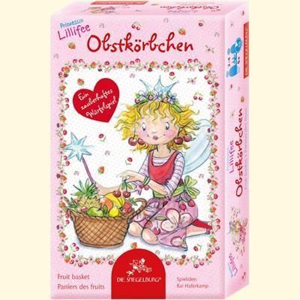 Lillifee themed game. The object is to fill fruit baskets with fruit tiles in a market. The pawn moves past those baskets; and at the end of each turn, a tile is turned over. If it is a kind of fruit needed for the basket next to the pawn, it is put in. When a basket is full, the player to put the last tile in gets a reward card. The player with most cards...