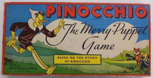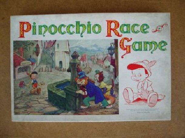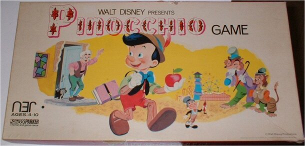The decorated title is «Walt Disney Presents Pinocchio Game». The object of this young children's game is to collect a set of colored cards showing Pinocchio as a real live boy. As the players go round the track (using a spinner), they draw cards and follow their instructions ("Return a Pinocchio Card", "Draw a Pinocchio Card and Move Forward Three...