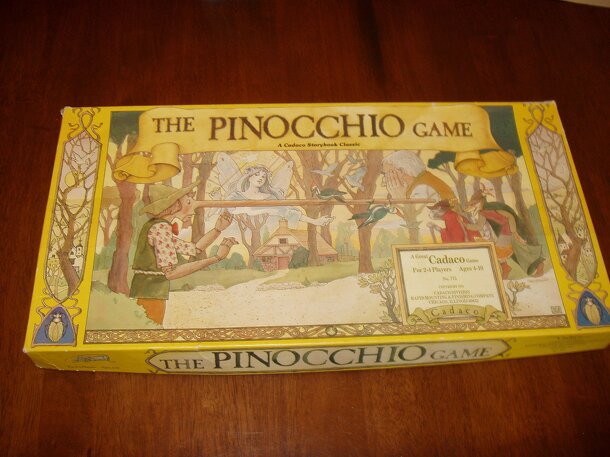 Players follow Pinocchio's adventures around the game board, trying to be the first to reach Pinocchio's dream and become a real boy. Players spin the spinner and either go back or forward a number of spaces, or draw a card. If a player draws an adventure card, she announces it and lays the card face down on the corresponding adventure on the board, and...