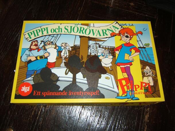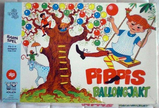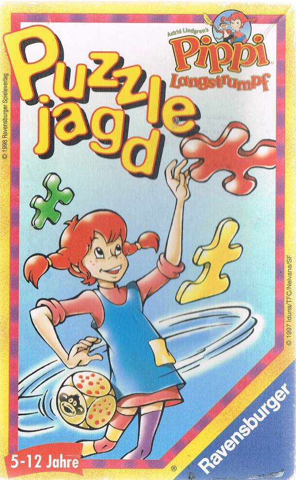 Childrens game where the players race to complete a jigsaw first. Each player chooses a different colour and is given the eight pieces that will make up a picture of Pippi Langstrumpf. In your turn, you roll the special die. The die has freckles instead of numbers except for the face that shows the monkey Herr Nilsson. If the monkey is rolled, that player...