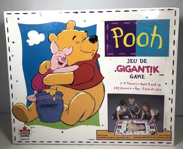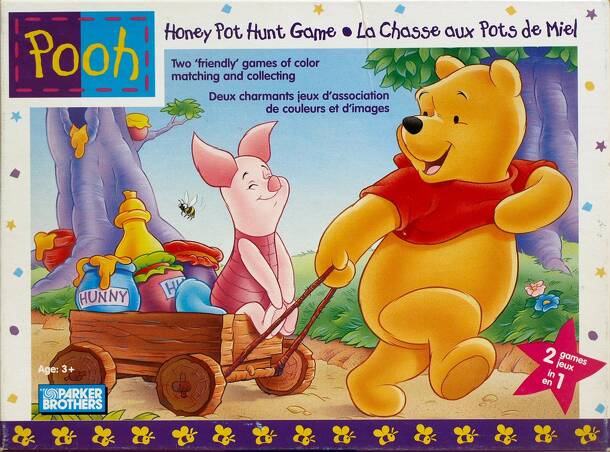 From the box: Winnie the Pooh has run out of Hunny. Help your best loved Pooh characters -- Eeyore, Tigger, Rabbit, and Owl -- surprise Pooh by collecting Hunny pots for him. But beware of the bees... they want their Hunny back! (21 disks are hunny pots, 7 are bees). The player that collects the most Hunny pots at the end of the game wins. This game comes...