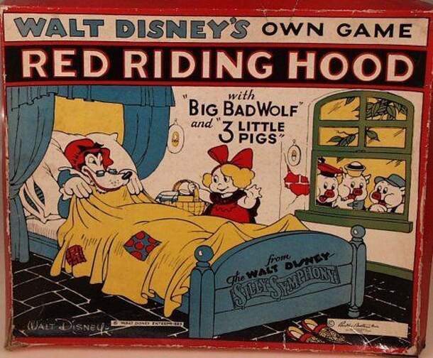 In this children's track game, based on the Walt Disney Silly Symphonies, players take on the roles of Little Red Riding Hood and the Three Little Pigs attempting to elude the Big Bad Wolf. On your turn, you spin the spinner and move along any of the paths the number indicated trying to avoid Big Bad Wolf spaces. Some Big Bad Wolf spaces send you...